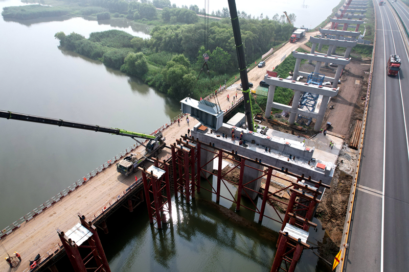 為確保首片鋼箱梁架設(shè)順利安全進(jìn)行,項(xiàng)目部根據(jù)施工要求提前籌劃,編制專項(xiàng)施工方案及應(yīng)急預(yù)案,對(duì)作業(yè)人員進(jìn)行專項(xiàng)培訓(xùn)和詳細(xì)安全技術(shù)交底,對(duì)架設(shè)全過程做了詳細(xì)周密的部署安排,為首梁的順利架設(shè)奠定了堅(jiān)實(shí)的基礎(chǔ)。架設(shè)過程中,項(xiàng)目部嚴(yán)格按照施工規(guī)范、質(zhì)量安全體系標(biāo)準(zhǔn),在監(jiān)理單位的監(jiān)督指導(dǎo)下,對(duì)提、運(yùn)、架等關(guān)鍵工序?qū)訉影殃P(guān),梁片架設(shè)各環(huán)節(jié)、各工種有條不紊地進(jìn)行著,最終實(shí)現(xiàn)了首片鋼箱梁的安全有序精準(zhǔn)架設(shè),標(biāo)志著項(xiàng)目橋梁上部結(jié)構(gòu)施工進(jìn)入了嶄新階段,為加快實(shí)現(xiàn)建設(shè)目標(biāo)邁出了堅(jiān)實(shí)的一步。