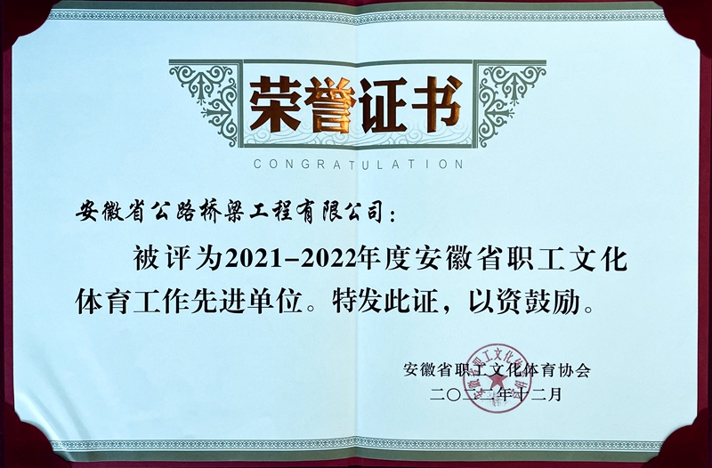 近日,安徽省職工文化體育協(xié)會發(fā)布了《關(guān)于表彰安徽省職工文化體育工作先進(jìn)單位的通報(bào)》,授予安徽省公路橋梁工程有限公司等13家企事業(yè)單位“2021-2022年度安徽省職工文化體育工作先進(jìn)單位”稱號。