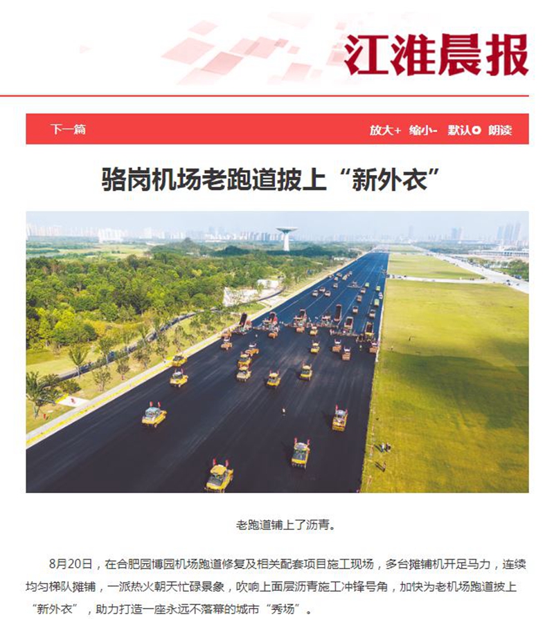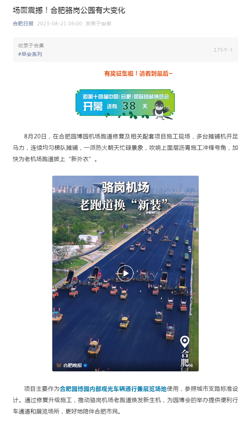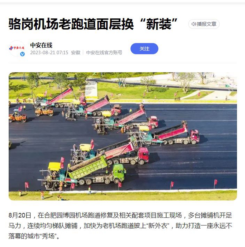 8月20日,公司承建的駱崗中央公園合肥園博園機(jī)場跑道修復(fù)工程項(xiàng)目進(jìn)行瀝青攤鋪施工,中安在線、合肥日報(bào)、江淮晨報(bào)和合肥晚報(bào)等多家省市級媒體聚焦報(bào)道。