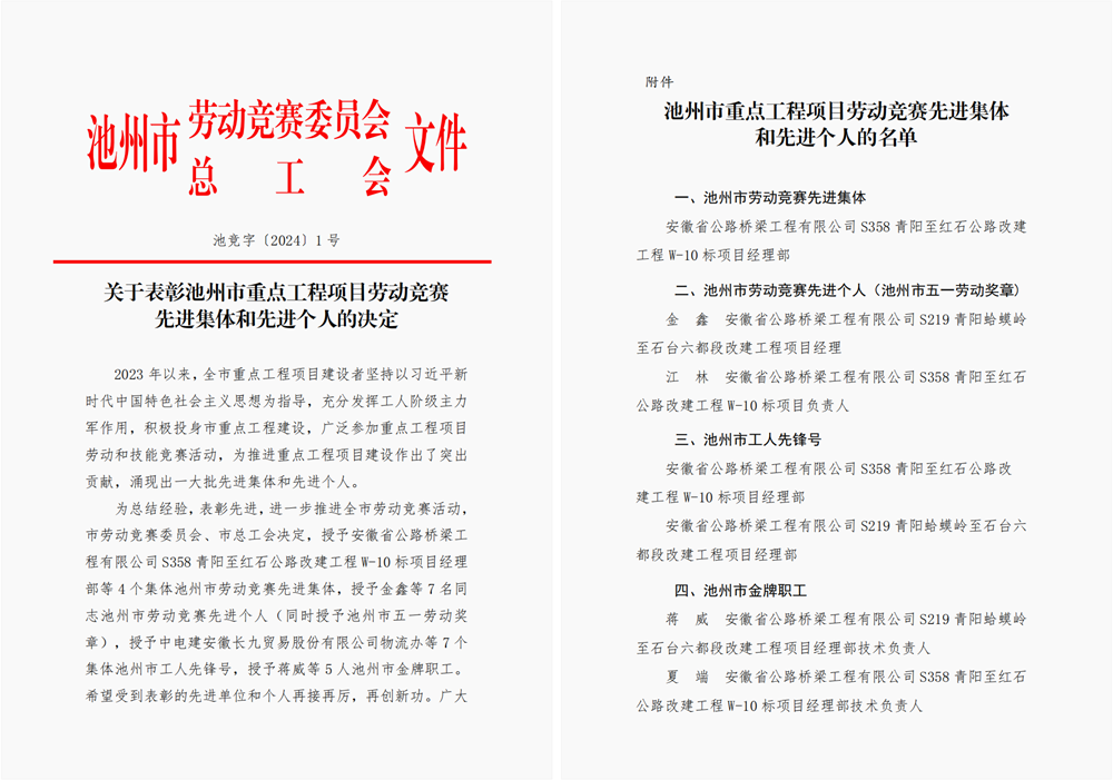 近日,池州市勞動(dòng)競賽委員會、市總工會印發(fā)《關(guān)于表彰池州市重點(diǎn)工程項(xiàng)目勞動(dòng)競賽先進(jìn)集體和先進(jìn)個(gè)人的決定》,公司所屬S358青陽至紅石公路改建工程W10標(biāo)項(xiàng)目經(jīng)理部獲評“市勞動(dòng)競賽先進(jìn)集體”,金鑫、江林兩名同志獲評“市勞動(dòng)競賽先進(jìn)個(gè)人”,同時(shí)授予池州市五一勞動(dòng)獎(jiǎng)?wù)?;S358改建W10標(biāo)、S219青陽改建兩個(gè)項(xiàng)目獲評“市工人先鋒號”,蔣威、夏端兩名同志獲評池州市“金牌職工”。