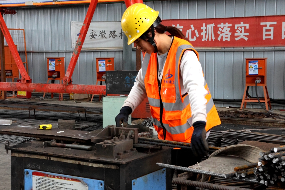 在G329改建工程項目預(yù)制梁場的鋼筋加工棚內(nèi),工人正在對預(yù)制梁所需要的鋼筋進行彎曲。目前,該項目橋梁已進入橋面系施工階段,路基施工正式進入瀝青攤鋪階段。