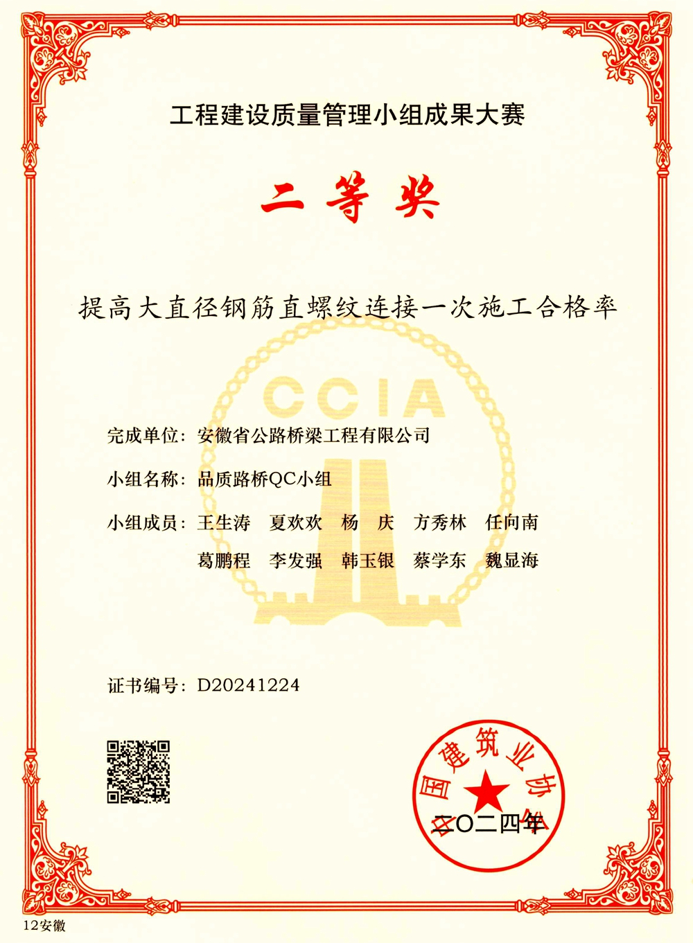 本次QC決賽共發(fā)布751項成果。公司推薦的《提高索導(dǎo)管定位安裝一次性驗收合格率》《提高現(xiàn)澆箱梁波紋管準(zhǔn)確安裝一次性驗收合格率》2項QC成果獲一等獎,《提高大直徑鋼筋直螺紋連接一次施工合格率》QC成果獲得二等獎。