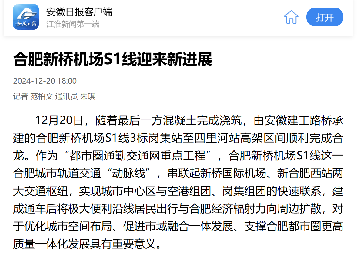 【名媒聚焦】央廣網(wǎng)、安徽日?qǐng)?bào)、中安在線等主流媒體聚焦報(bào)道合肥新橋機(jī)場(chǎng)S1線3標(biāo)崗四高架區(qū)間橋梁合龍