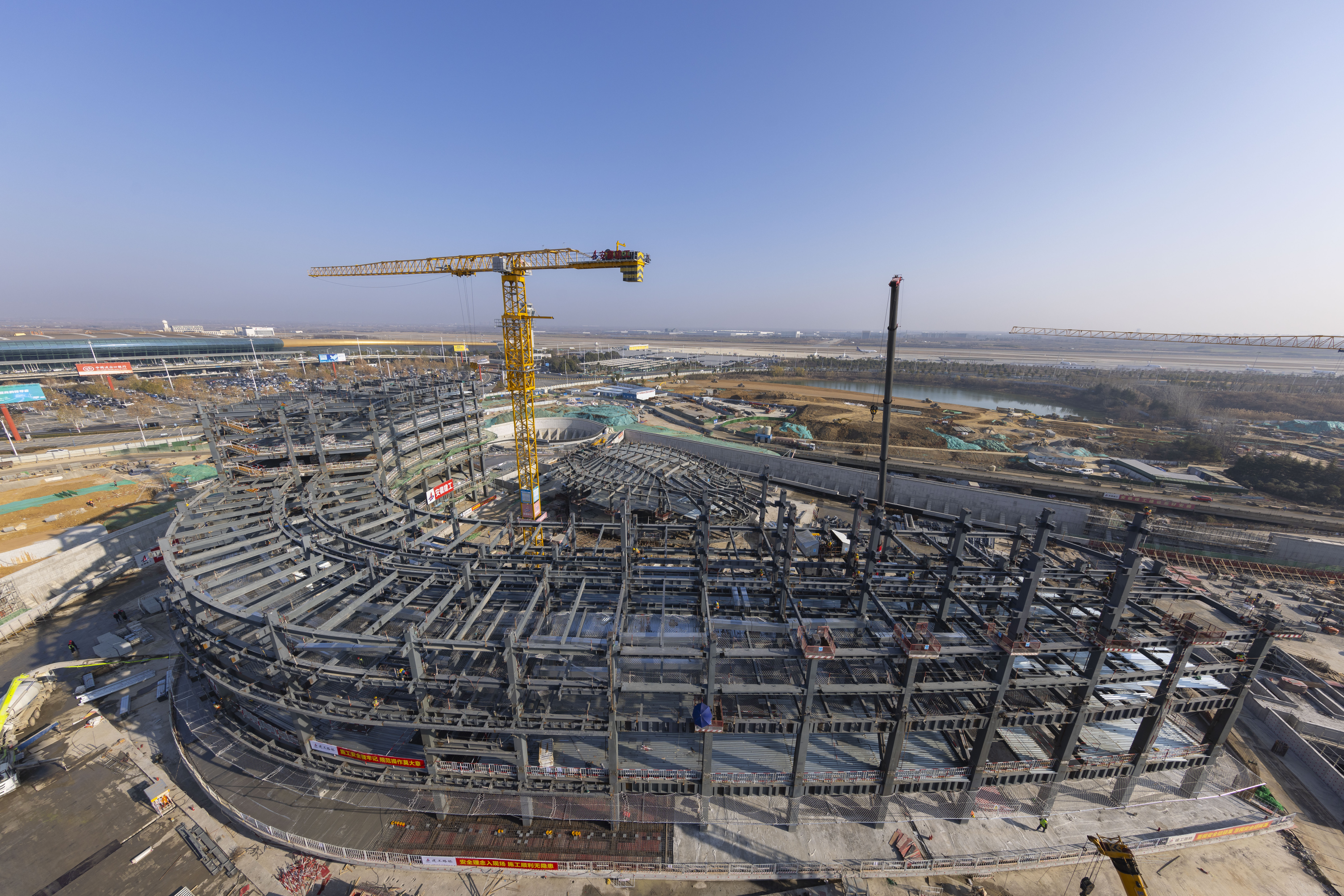 1月5日,合肥新橋國(guó)際機(jī)場(chǎng)改擴(kuò)建工程現(xiàn)場(chǎng),安徽建工集團(tuán)的工人正在施工。當(dāng)前合肥新橋國(guó)際機(jī)場(chǎng)改擴(kuò)建工程正穩(wěn)步推進(jìn)中。T2航站樓正全面推進(jìn)屋面鋼結(jié)構(gòu)、幕墻和二次結(jié)構(gòu)砌筑施工,同步推進(jìn)機(jī)電安裝。綜合交通中心項(xiàng)目主體結(jié)構(gòu)已全面封頂。