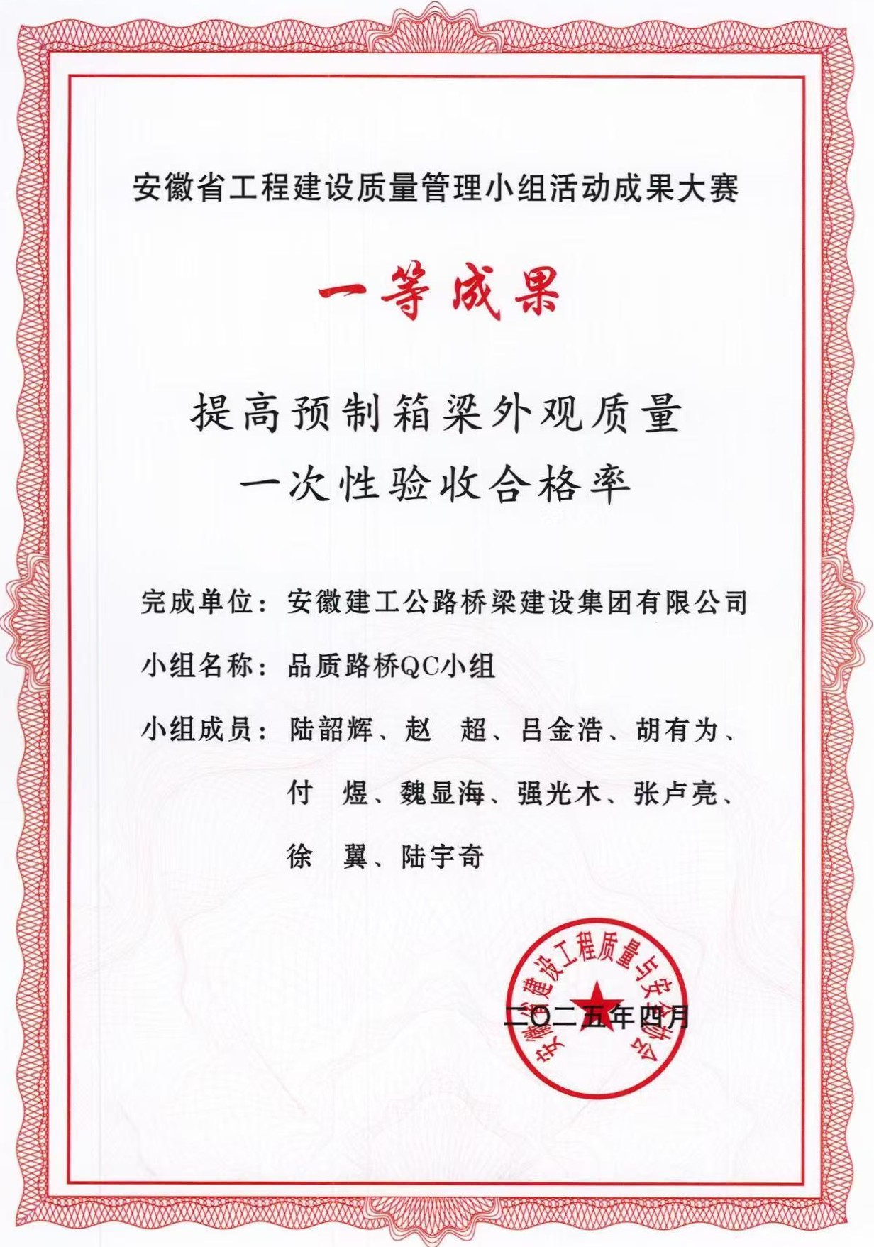 黨支部牽頭組建“品質(zhì)路橋”QC小組,聚焦預制箱梁外觀質(zhì)量痛點,對材料管理實行原材料進場雙檢,針對性開展關鍵材料性能試驗;預制工藝嚴控模板拼裝精度,優(yōu)化混凝土振搗方式。改進后,預制箱梁外觀合格率從89.67%提升至95.44%,每片修飾時間縮短2小時。成果《提高預制箱梁外觀質(zhì)量一次驗收合格率》獲安徽省QC成果一等獎,以“紅色匠心”護航工程品質(zhì)。