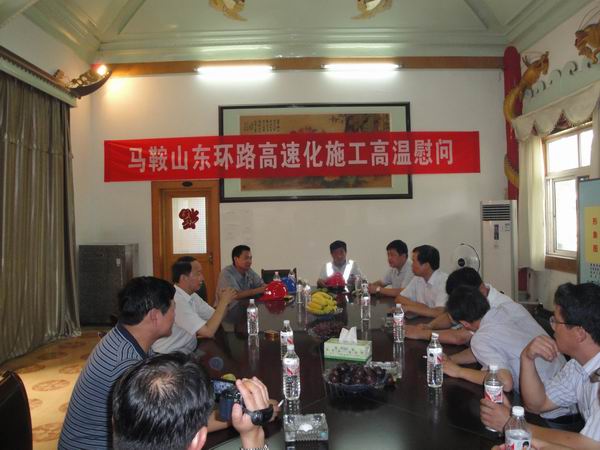 在我項(xiàng)目部大廳,王書記首先發(fā)表了熱情洋溢的講話,高度贊揚(yáng)了我項(xiàng)目勇戰(zhàn)高溫、搶抓工期、誓保質(zhì)量的大無(wú)畏施工精神。隨后,王書記又送上了慰問(wèn)信,并與員工代表們一一握手,發(fā)放慰問(wèn)金、慰問(wèn)品。最后,在項(xiàng)目部會(huì)議室,王書記一行與蘇指揮長(zhǎng),蔡主任、江主任,總監(jiān)代表郭亮以及我部項(xiàng)目經(jīng)理冷峰等進(jìn)行座談,詳細(xì)了解了我南環(huán)02標(biāo)項(xiàng)目的整體情況以及近期施工的進(jìn)展情況,希望我部繼續(xù)發(fā)揚(yáng)安徽省路橋公司攻堅(jiān)克難的優(yōu)良傳統(tǒng),保質(zhì)保量的如期完成東環(huán)02標(biāo)項(xiàng)目建設(shè)任務(wù)。
