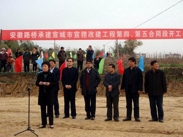11月28日上午,在宣貍路改建工程第五合同段K34+740施工現(xiàn)場響起了歡快的鞭炮聲,鮮艷的彩旗熱情地歡迎四方賓朋,宣貍路改建工程第四、第五合同段開工儀式隆重舉行。出席儀式的有宣城市交通局總工程師、建委副主任夏志海、宣州區(qū)副區(qū)長傅葵、宣州區(qū)交通局局長胡學斌、宣州區(qū)宣貍路征遷協(xié)調(diào)組副組長江國平、貍橋鎮(zhèn)書記楊承保、貍橋鎮(zhèn)鎮(zhèn)長時國全、總監(jiān)代表邱旭光、駐地柏玉坤、安徽省路橋公司黨委書記陳光磊、副總經(jīng)理盛明宏以及朱橋和沈村鄉(xiāng)鎮(zhèn)領(lǐng)導、沿線村委會代表、村民代表等相關(guān)人員。