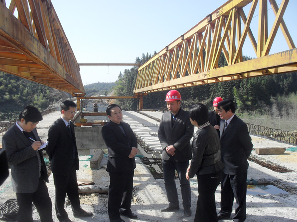 在金字牌大橋現(xiàn)場(chǎng),項(xiàng)目經(jīng)理黃華就項(xiàng)目工程總體完成情況、剩余工程量、下步計(jì)劃安排以及金字牌跨皖贛鐵路橋的施工進(jìn)展情況作了詳細(xì)匯報(bào)。王福宏書記深入到箱梁安裝施工現(xiàn)場(chǎng),對(duì)施工進(jìn)展情況進(jìn)行了詳細(xì)的察看,對(duì)該標(biāo)段的建設(shè)情況表示了肯定;并要求該標(biāo)段在抓進(jìn)度的同時(shí)要保證質(zhì)量、安全,確保圓滿完成剩余工程量。王福宏書記還代表黃山市委、市政府對(duì)該標(biāo)段建設(shè)者表示親切慰問(wèn)。