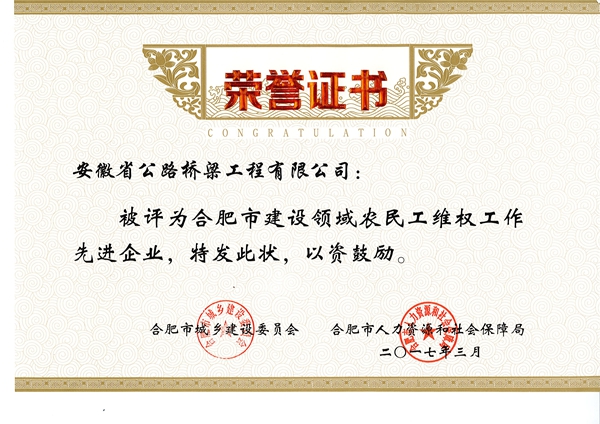 公司榮獲“合肥市建設(shè)領(lǐng)域農(nóng)民工維權(quán)工作先進企業(yè)” 稱號 發(fā)布時間:2017年04月27日 來源:市政分公司 發(fā)布人: 作者:董丁祥 瀏覽:2801次 近日,合肥市城鄉(xiāng)建設(shè)委員會、人力資源和社會保障局表彰了在建設(shè)領(lǐng)域農(nóng)民工維權(quán)工作中表現(xiàn)突出的單位,公司榮獲“合肥市建設(shè)領(lǐng)域農(nóng)民工維權(quán)工作先進企業(yè)” 稱號。