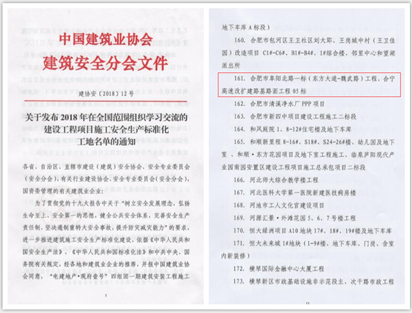 近日,從中國建筑業(yè)協(xié)會建筑安全分會傳來喜訊,公司承建的阜陽北路高架01標(biāo)和合寧高速改擴建路基路面工程05標(biāo)兩項工程榮獲“2018年全國建設(shè)工程項目施工安全生產(chǎn)標(biāo)準(zhǔn)化工地”榮譽稱號。