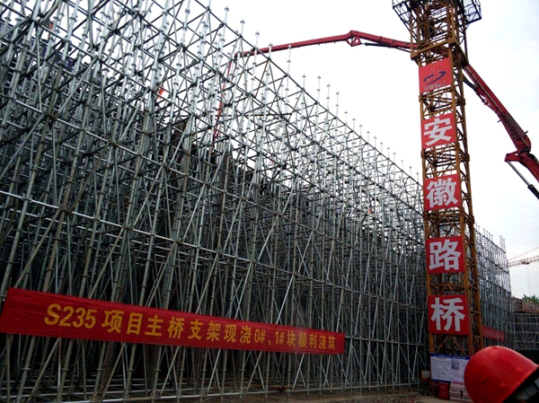 為突破原有施工方案對工程進度的瓶頸制約,項目部多方聯(lián)系,充分論證優(yōu)化方案,一方面,將主橋原定的碗扣支架改為盤扣支架施工,大大加快了搭拆速度,提高了質量與安全,有效節(jié)約了成本。另一方面,將原先的半幅現(xiàn)澆調整為全幅現(xiàn)澆方案,有效縮短了工期。