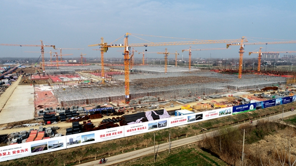 2月12日,農(nóng)歷大年初一,在舒城縣智慧電子小鎮(zhèn)EPC總承包項(xiàng)目施工現(xiàn)場(chǎng),數(shù)百名工人正在進(jìn)行廠房鋼筋幫扎、支架搭設(shè)。