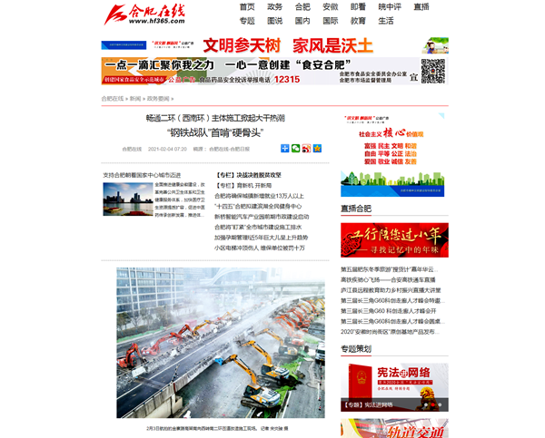 人民網【新春走基層】專欄報道了該項目大年三十工地不打烊,參建人員持續(xù)奮戰(zhàn)在施工一線。中國日報海外版《End of the road》、合肥日報《“鋼鐵戰(zhàn)隊”首啃“硬骨頭”》報道了公司第二次對老舊匝道橋拆除工作的場景。安徽衛(wèi)視超級新聞場等媒體以《“鋼鐵戰(zhàn)士”組隊 南二環(huán)改造工程第二階段施工啟動》報道了南二環(huán)改造工程順利進入第二階段施工節(jié)點的訊息。學習強國合肥學習平臺、澎湃新聞以《合肥:暢通南二環(huán) 鉚足干勁 大干正酣》為題,合肥新聞聯(lián)播以《“步履不?!北惩?nbsp;建設按下“快進鍵”》《過年堅守南二環(huán) 來年道路早暢通》為題,報道了春節(jié)期間該項目施工現(xiàn)場干出的“加速度”。抖音等自媒體平臺以短視頻形式展示了數(shù)十臺機械同時作業(yè)的震撼場面,關注熱度超過3百萬,安徽路橋速度得到合肥市民的再次點贊。
