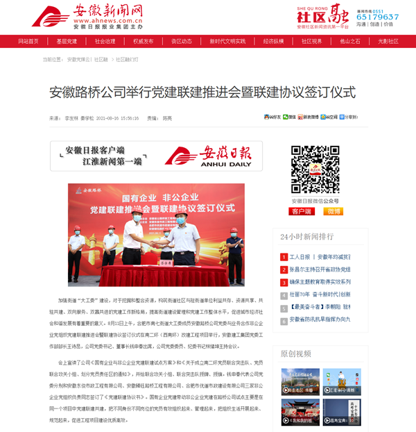 【名媒聚焦】《安徽新聞網(wǎng)》報(bào)道公司國有企業(yè)與非公企業(yè)黨建聯(lián)建簽訂儀式
