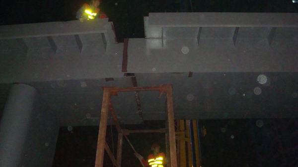 晚上21:30,運(yùn)梁車準(zhǔn)時將A梁運(yùn)達(dá)施工區(qū),隨即北一環(huán)南側(cè)在交警的協(xié)助下,按計劃全封閉。經(jīng)過近一個多小時的安裝,晚上23:00整,張洼路天橋施工區(qū)響起了一陣陣掌聲,禮炮隨后騰空燃起——A梁成功安裝了。B梁在隨后的3個小時內(nèi)也成功完成安裝。
