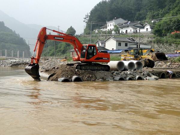 從27日開始,天氣放晴,水位下降,我部抓住機(jī)會進(jìn)行第三次搶修,一臺挖機(jī)、一臺裝載機(jī)和五臺運(yùn)輸車同時作業(yè),終于在28日上午打通便橋。項目部迅速組織人員把施工設(shè)備、施工材料調(diào)運(yùn)到對面,28日下午恢復(fù)小型結(jié)構(gòu)物施工。