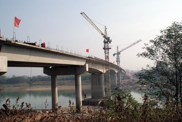 青弋江大橋全長454米,凈寬11米,結(jié)構(gòu)形式為30×10+70+42×2的簡支箱梁與現(xiàn)澆懸臂橋。該工程于2007年開工,前期由于施工條件的限制和其它不利因素,工程進展頗不順利。后來在公司領(lǐng)導的大力支持下,全體施工人員上下合力,積極創(chuàng)造條件進行施工,全橋終于順利合龍。盛總在合龍現(xiàn)場指出,雖然大橋已順利合龍貫通,但后期任務(wù)還相當艱巨,橋面、護欄、橋頭搭板和護坡等都需要抓緊施工,在保證質(zhì)量、保證安全的情況下,組織力量加快施工進度,確保實現(xiàn)元月通車的目標。