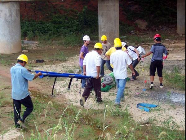 接下來,對參演人員進行角色分工和任務(wù)分配。所有參加演練的人員來到項目正在進行的30米箱梁預(yù)制場門架附近待命。4點鐘,演練行動正式開始。項目負責(zé)人接到報告,K11+300水陽江1#橋面施工區(qū)域發(fā)生高墜事故。由于水陽江橋施工現(xiàn)場地處偏遠,距離主干道路和項目部及醫(yī)院都較遠,給自救和救援帶來嚴重考驗。搶救疏散組及時啟動《高墜事故應(yīng)急救援預(yù)案》,在以項目經(jīng)理為主的事故應(yīng)急救援領(lǐng)導(dǎo)小組領(lǐng)導(dǎo)下,各事故應(yīng)急救援機構(gòu)各司其職。搶救疏散組立即組織搶救受傷人員,將汽車、設(shè)備、救護人員派到事發(fā)地點,并對現(xiàn)場人員進行疏散隔離。救護人員第一時間對高墜傷者進行了初步檢查,判定傷者暫時沒有生命危險,并對其發(fā)生骨折的右上肢進行了夾板保護,在搶救疏散組的協(xié)作下,傷者立即通過擔(dān)架進行轉(zhuǎn)移,送往醫(yī)院。