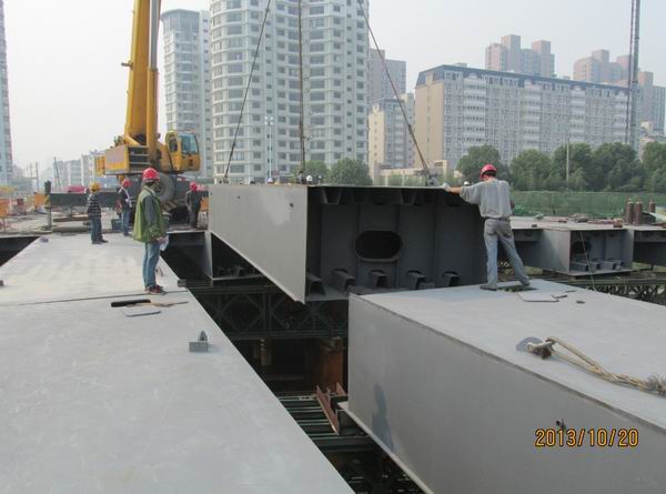 回顧跨南淝河橋鋼箱梁的施工過程,項(xiàng)目全體員工共同努力,克服了許多技術(shù)和吊裝難題。工程前期現(xiàn)場勘查發(fā)現(xiàn),橋梁東側(cè)位于現(xiàn)狀110kv高壓線下,河南岸的東側(cè)和西側(cè)分別有高壓鐵塔和污水泵站,大噸位吊車無法滿足安全施工條件。項(xiàng)目部技術(shù)人員根據(jù)橋型特點(diǎn)和場地特殊環(huán)境、設(shè)備要求, 上報(bào)設(shè)計(jì)單位將原設(shè)計(jì)20+30+20m三個(gè)制作段架設(shè)變更為16+10+18+10+16m五段架設(shè),并通過專家論證評審,解決了關(guān)于鋼箱梁架設(shè)存在的重要疑難。后期架設(shè)時(shí)為了確保吊裝100%安全,杜絕安全隱患,通過項(xiàng)目部與多方努力協(xié)調(diào),在10月20日架設(shè)東側(cè)110kv高壓線下鋼箱梁時(shí),高壓線暫停供電。全力做到放心安全的架好每一片梁。